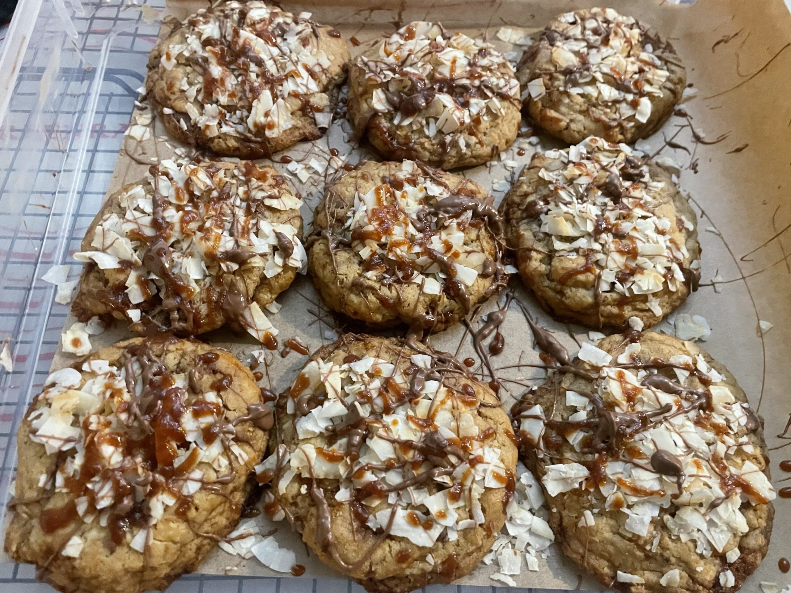 Brown Butter sourdough with roasted coconut, homemade salted caramel, milk chocolate chunks, with salted caramel and milk chocolate drizzles